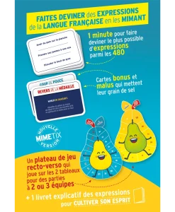 Faites deviner des expressions de la langue française en les mimant. Un jeu familial autour de 480 expressions, avec des cartes bonus et malus. Jouez, mimez, rigolez ! Nouvelle version du célèbre jeu de mime pour se fendre la poire tout en redécouvrant les expressions de la langue française !