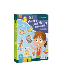 Qui cherche quoi où comment? est conçu pour solliciter chez l’enfant de 2 à 4 ans la compréhension de concepts de base comme « petit », « gros », « dans », « devant », « au-dessus », etc. Les différents niveaux de jeu proposés permettent à l’enfant de saisir des concepts de plus en plus complexes.