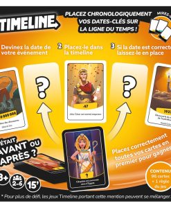 C'était avant ou après ? Timeline est un jeu de cartes pour 2 à 6 joueurs. Cette nouvelle édition 2025 de Timeline reprend toujours le même principe de jeu : classez les évènements dans l'ordre chronologique pour réussir à vous débarrassez de toutes vos cartes. Et si vos connaissances vous font défaut, fonctionnez à la logique ou à l'intuition.