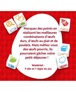 Lancez les dés pour obtenir des combinaisons d'œufs et la cuisson qui leur est associée pour marquer des points. Mais attention : les œufs pourris risquent fort de gâter votre petit-déjeuner !