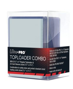 Ce set contient 1 boite de rangement en plastique ainsi que 25 toploaders et 25 sleeves standards.