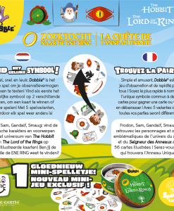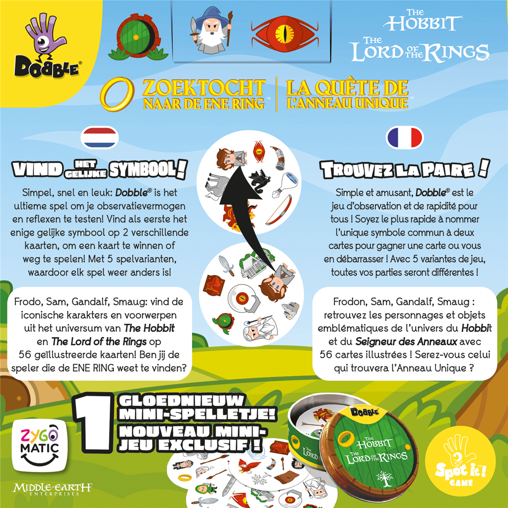Avec Dobble Le Seigneur des anneaux – Le Hobbit, repérez le seul symbole identique entre deux cartes et soyez le plus rapide à scorer ! Tous les éléments et personnages emblématiques de l’oeuvre de J.R.R Tolkien (repris dans les films) sont présents dans ce jeu d’observation où s’affrontent petits et grands. Soyez encore plus observateur que l’Oeil de Sauron pour repérer les Hobbits et leurs compagnons sur les cartes rondes. Laissez ensuite votre rapidité et vos réflexes vous mener jusqu’à la Victoire !