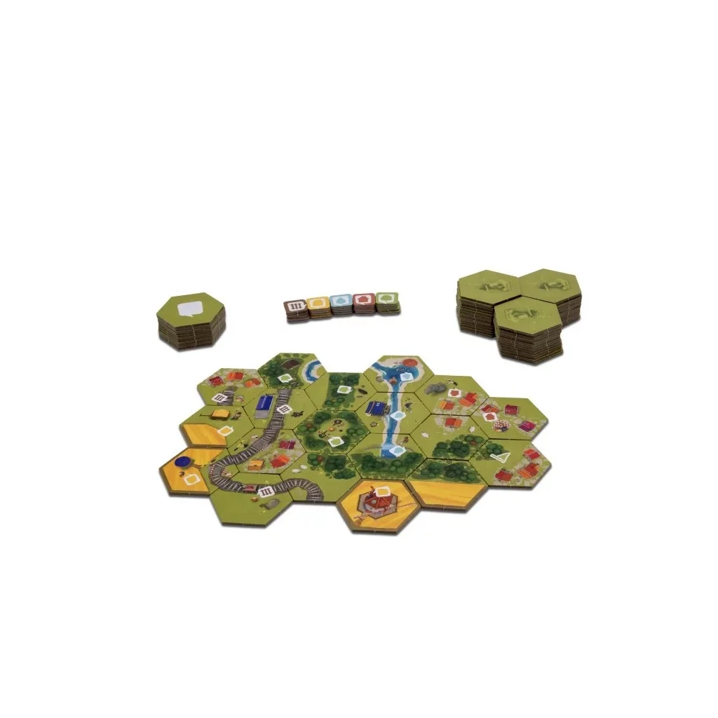 Dans Dorfromantik, jusqu’à six joueurs travaillent ensemble pour poser des tuiles hexagonales afin de créer un beau paysage et essayer d’exécuter les commandes de la population, tout en posant une piste de chemin de fer et une rivière aussi longues que possible, mais aussi en tenant compte des drapeaux qui donnent des points dans les zones fermées.