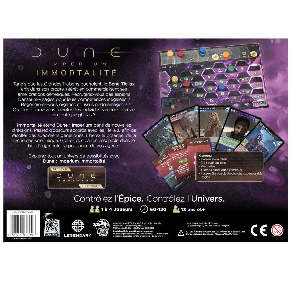 Explorez tout un univers de possibilités avec Dune Imperium Immortalité ! Passez d’obscurs accords avec les Tleilaxu afin de récolter des spécimens génétiques. Libérez le potentiel de la recherche scientifique. Greffez des cartes ensemble dans le but d’augmenter la puissance de vos agents.