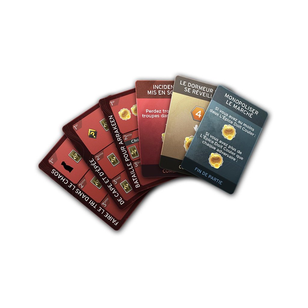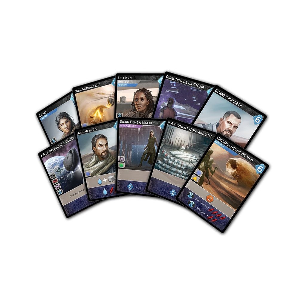 Battez vos adversaires au combat, manipulez habilement les factions politiques, et obtenez les précieuses cartes « »L’épice doit couler » » pour mener votre Maison à la victoire ! »