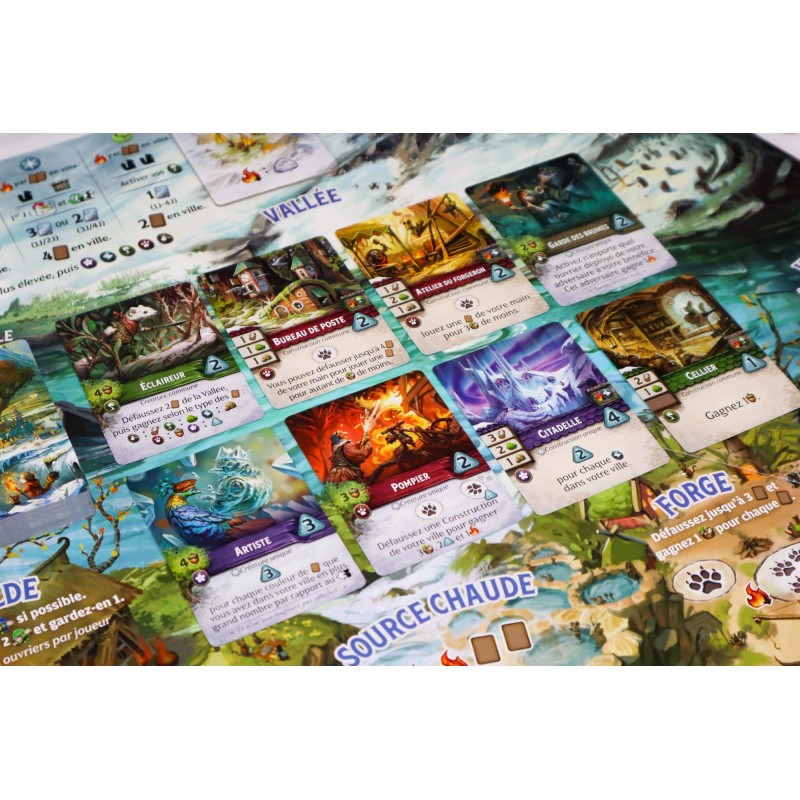 Vous pouvez placer un de vos ouvriers sur n’importe quel lieu de base, sur une carte de destination rouge de votre ville ou des villes adverses, à la Forge, aux Sources chaudes ou sur une balise au sommet d’une montagne, tant qu’elle n’est pas bloquée par la Neige ou un autre ouvrier. Récupérez ensuite les ressources indiquées ou effectuez l’action. S’il y a de la neige à cet endroit, vous devez d’abord dépenser une ressource Feu pour dégager le tas de neige. Si vous utilisez votre ouvrier Ranger unique, vous pouvez visiter un endroit occupé ou obtenir une ressource Feu si vous vous y rendez seul.