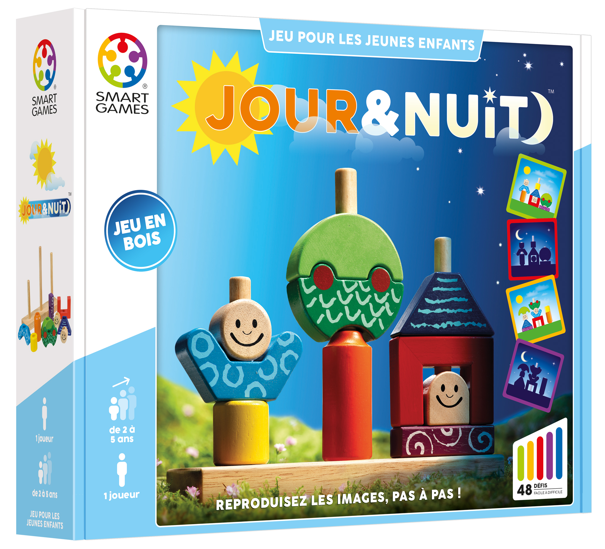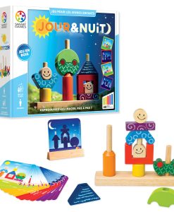 Ici dans Jour et nuit, les enfants vont devoir placer les pièces de différentes formes selon un modèle de départ. Ils placeront donc les objets sur une base en bois, composée de trois tiges de différentes tailles. Il y a des défis côté jour, où la couleur nous montre telle ou telle pièce à utiliser. Par contre côté nuit, toutes les pièces seront dans l’ombre et cela sera aux enfants de déduire où iront les différentes pièces.