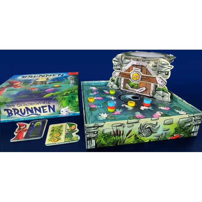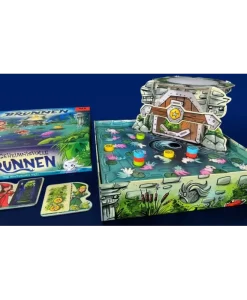 Dans Le Puits Mystérieux, vous explorez un puits en trois dimensions doté d’un ingénieux mécanisme rotatif. Chaque manche commence par l’insertion secrète d’un disque « lutin » dans le puits. Au départ, impossible de distinguer quoi que ce soit ! Mais à mesure que le tourbillon magique tourne, les couleurs puis les silhouettes des lutins apparaissent progressivement. Les joueurs doivent analyser attentivement ce qu’ils perçoivent et déplacer leurs grenouilles sur les nénuphars pour les positionner à côté des bons lutins.