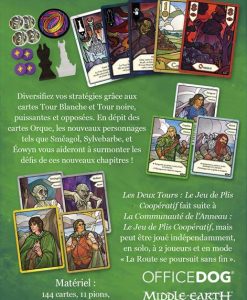 Retournez dans l’univers captivant de la Terre du Milieu avec cette suite du jeu de plis coopératif La Communauté de l’Anneau. Cette boîte indépendante fait suite à La Communauté de l’Anneau et propose 18 chapitres inspirés du second livre de la saga de J.R.R. Tolkien. Chaque scénario est unique, avec ses propres règles, personnages et conditions.