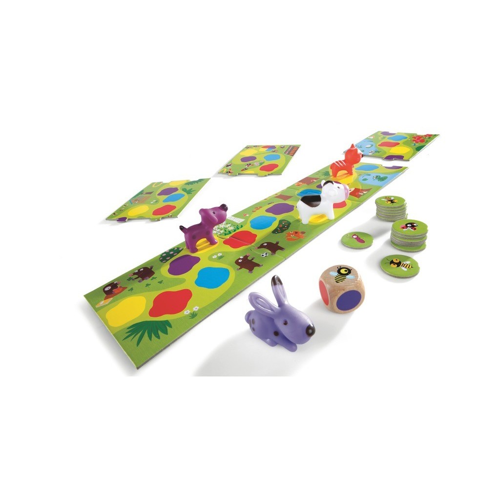 De petits animaux se promènent tout au long du chemin. Lance le dé, le dé indique la couleur rouge: le petit chien peut alors avancer jusqu’à la prochaine case rouge. Quel animal arrivera le premier au bout du chemin?