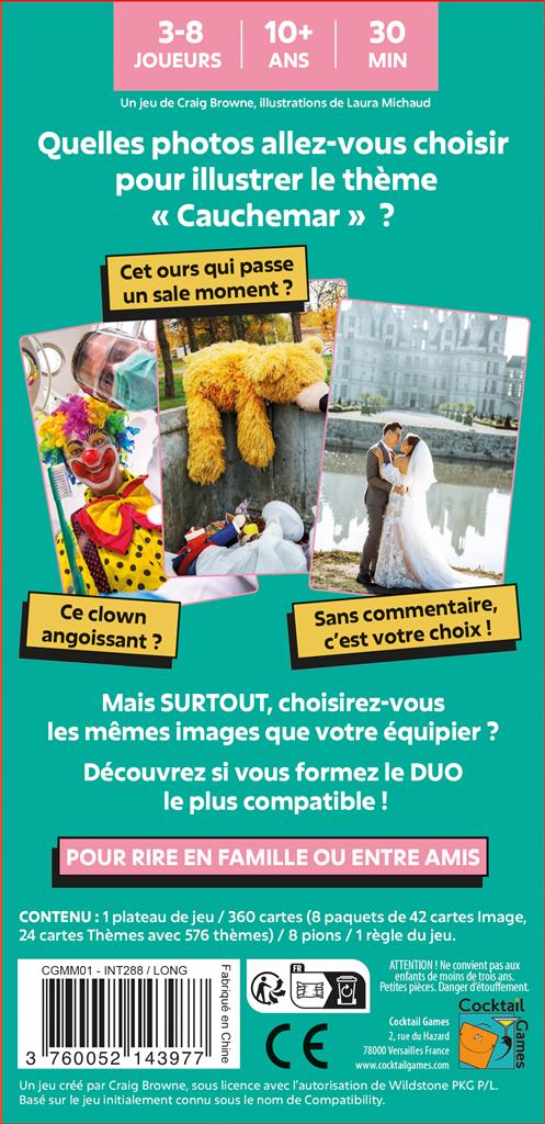 Matchy Matchy est un jeu d’ambiance délirant où votre mission est simple : choisir les mêmes images que votre équipier pour prouver à quel point vous êtes sur la même longueur d’onde ! Chaque équipe joue avec un paquet de 42 cartes Image identiques, illustrant toutes sortes de situations étranges, drôles ou complètement absurdes. Un thème est tiré au hasard, et chacun doit secrètement sélectionner les images les plus pertinentes… ou les plus inattendues.