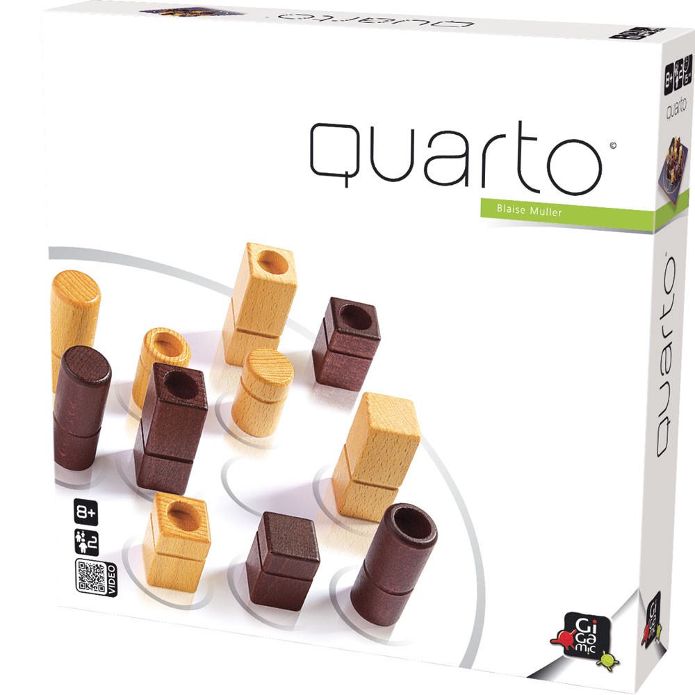 Quarto se base sur un tableau 4 × 4 et 16 pièces. Chaque pièce a quatre attributs dichotomiques – couleur, hauteur, forme et consistance – de sorte que chaque pièce est soit noire ou blanche, haute ou courte, carrée ou ronde, creuse ou solide. L’objectif est de placer la quatrième pièce dans une rangée dans laquelle les quatre pièces ont au moins un attribut en commun. La difficulté est que votre adversaire doit choisir la pièce que vous placez sur le plateau à chaque tour.