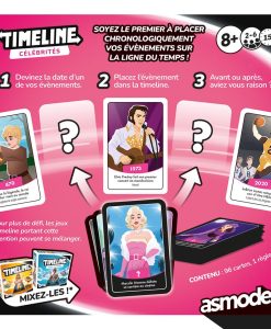 Dans Timeline : Célébrités, vous devrez placer vos cartes représentant des personnages célèbres dans l’ordre chronologique. Mais saurez-vous dire si Elvis a chanté avant ou après Marilyn ? Et Lebron James, est-il devenu champion NBA avant ou après Lady Gaga ? Pas besoin d’être historien : un peu de logique, quelques repères et le tour est joué !
