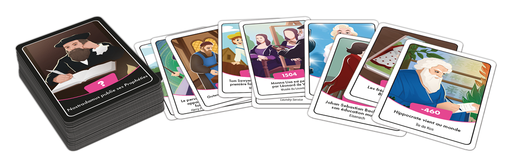 À votre tour, devinez la date d’un événement associé à une personnalité, et tentez de la replacer au bon endroit dans la ligne du temps. Si vous avez raison, la carte reste en place. Sinon, vous piochez ! Le premier à poser toutes ses cartes a gagné.