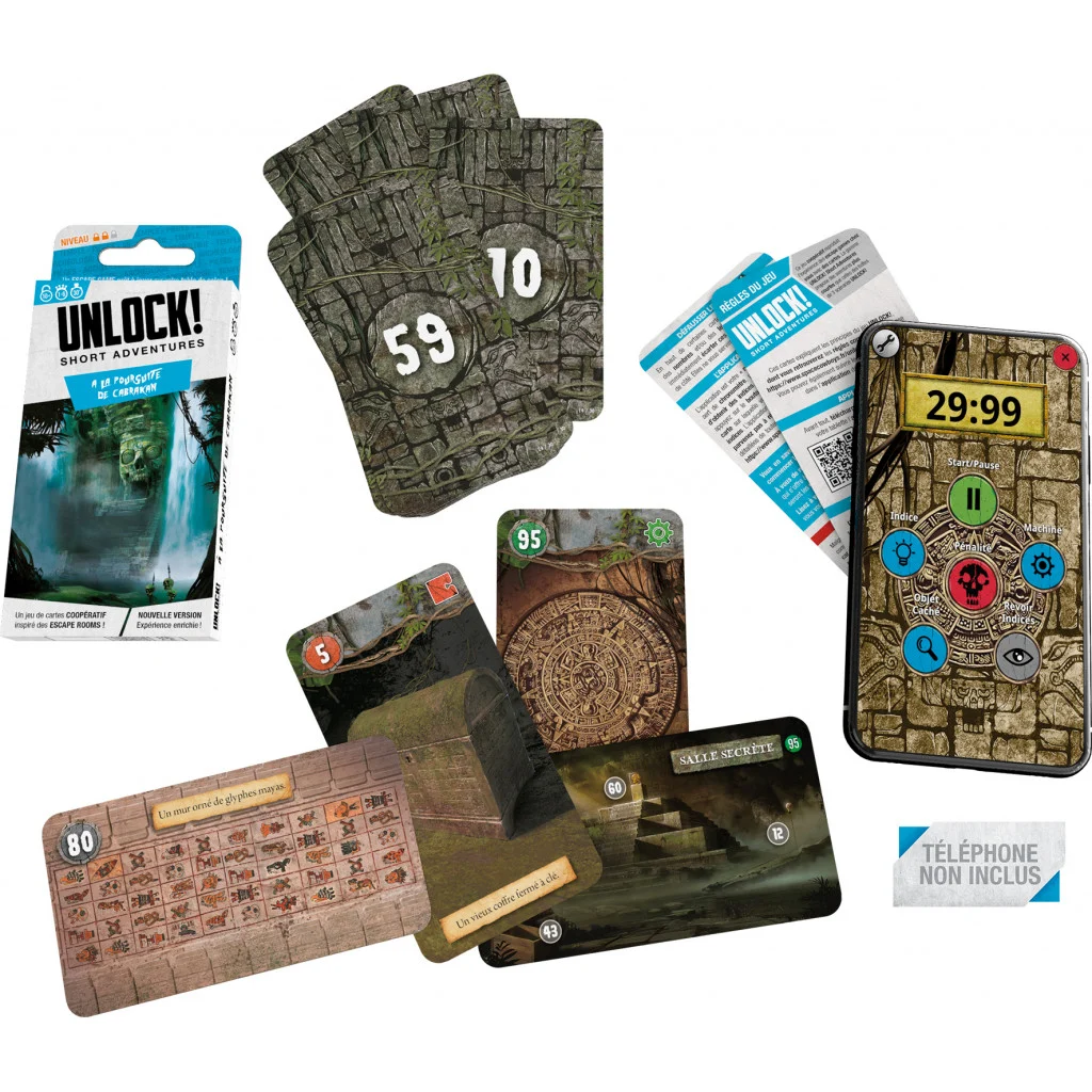 Unlock Short Adventures, ce sont des Unlock de 30 à 45 minutes en petit format, pratique à mettre dans la poche ou à offrir pour faire découvrir le jeu. Unlock ! est un jeu de carte coopératif inspiré des escape rooms. Unlock! vous fait vivre ces expériences chez vous, autour d’une table. Après avoir pris connaissance du contexte du scénario, vous commencez votre aventure dans une pièce (une carte de lieu qui indique divers numéros). Fouillez-la pour trouver des objets ! Attention : certains peuvent être cachés ! Des énigmes visuelles ou audio ralentissent votre progression. À vous de coopérer avec vos partenaires pour avancer et terminer dans les temps.