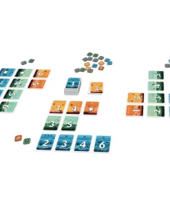 Pour commencer, créez un jeu de 15 cartes par joueur. Chaque carte est recto-verso, avec une couleur (bleu, vert ou orange), une valeur (1-6 ou un joker) et des points de victoire (1 ou 3) sur une face ; le verso aura une couleur différente, l’autre valeur de VP, et un nombre adjacent (4 ou 6 si le recto est un 5) ou un joker.